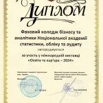 Отримання диплома за участь у міжнародній виставці Освіта та кар’єра 2024 є важливою відзнакою і свідчить про активну підтримку профорієнтаційних заходів та внесок у розвиток освіти та кар’єрних можливостей молоді. Це сприяє формуванню образу Фахового коледжу бізнесу та аналітики як сучасного та прогресивного навчального закладу, що підтримує ініціативи з важливих питань освіти та розвитку кар’єри.